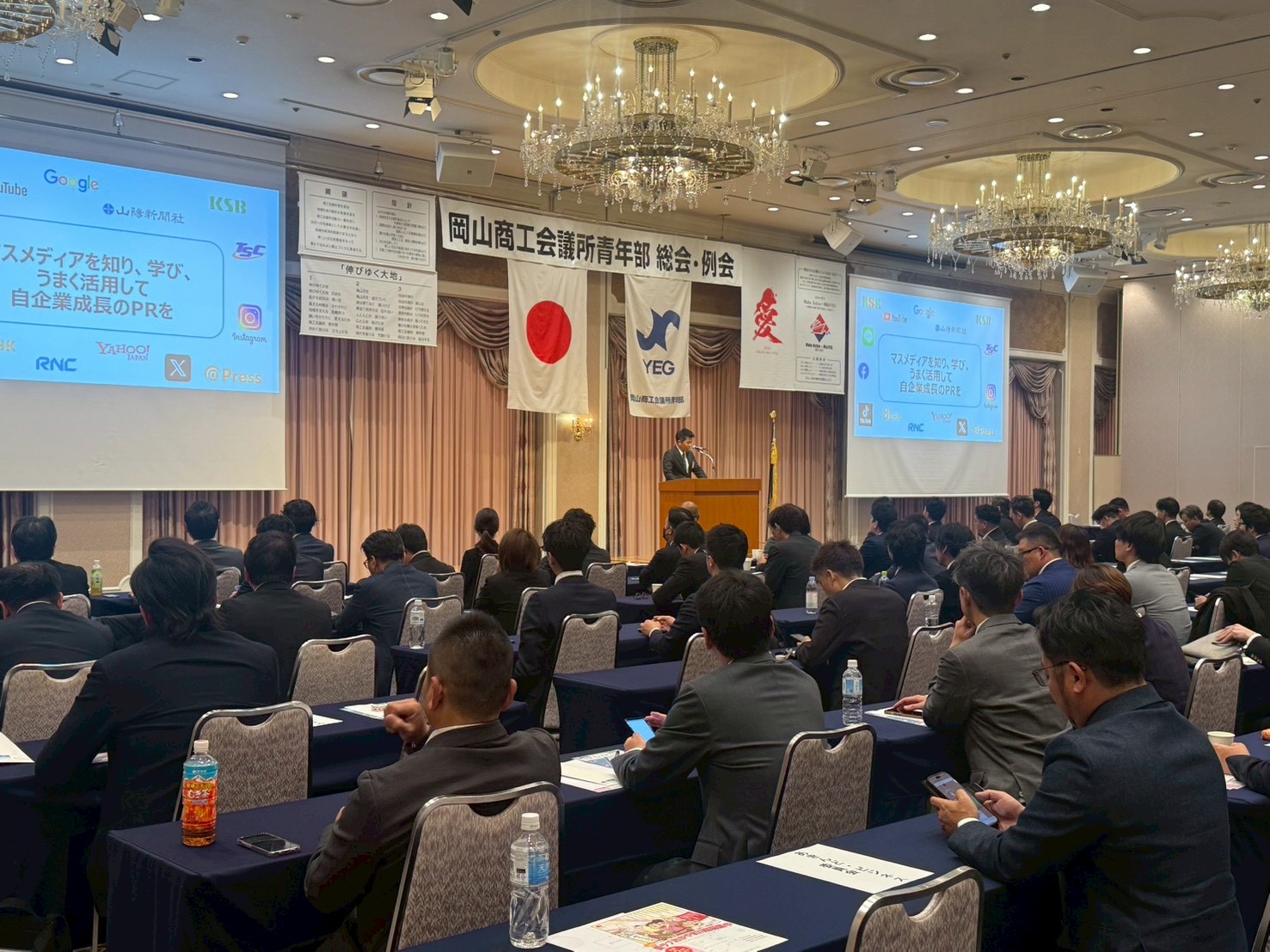 例会後には、事業「マスメディアを知り、学び、うまく活用して自企業成長のPRを」を開催。 主要マスメディアである新聞社、テレビ局、ラジオ局の社員に加え、デジタル分野で活躍する岡山YEG会員が登壇し、マスメディアの特性や変化するトレンドについて講演を行いました。 翌日から自社ですぐに活用できる内容や新たな発見が多く、メモを取る会員も多数見られ、学びの多い1時間となりました。